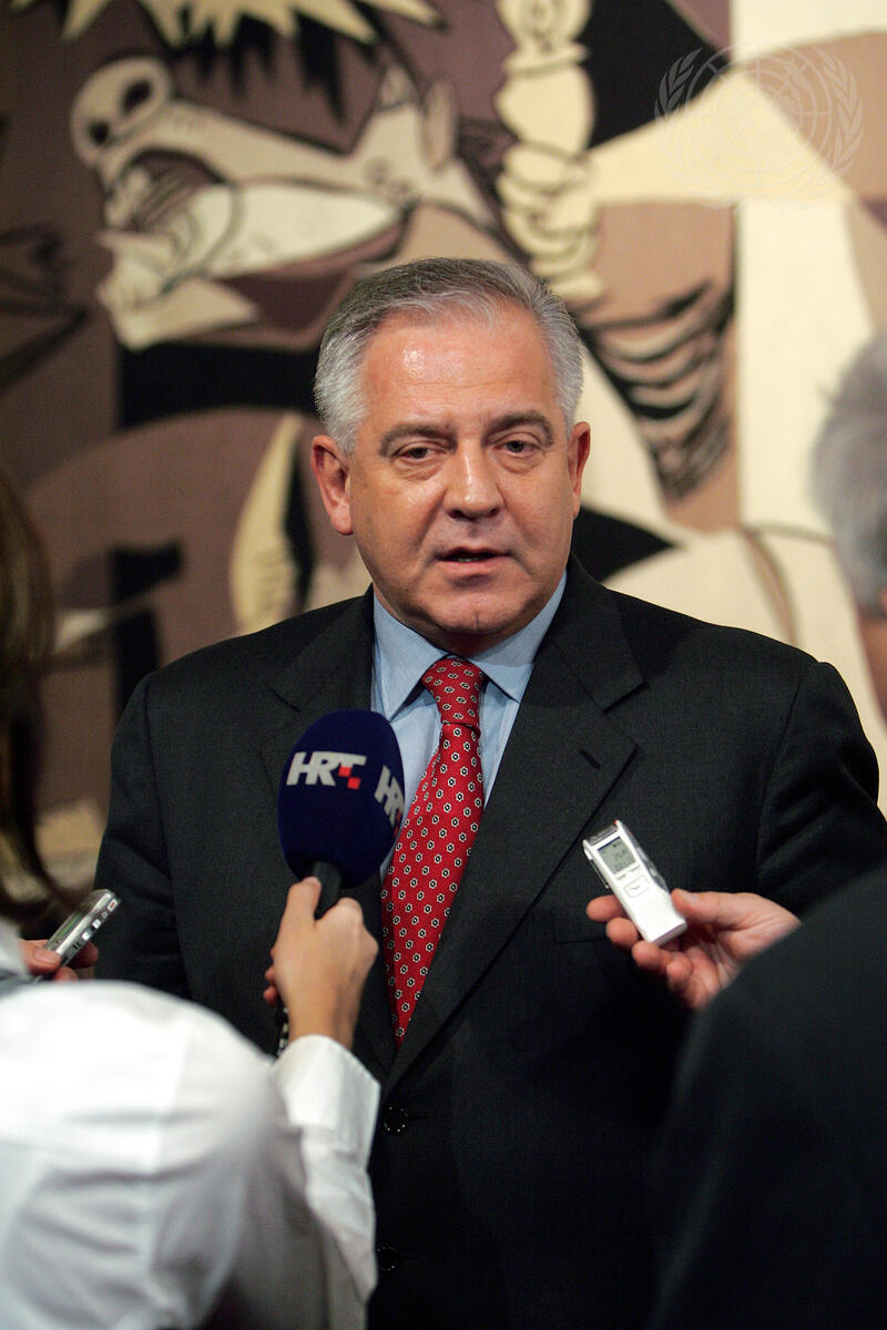 Ivo Sanader, Prime Minister of the Republic of Croatia, briefs the media prior to a Security Council meeting on the situation in the Somali Republic.