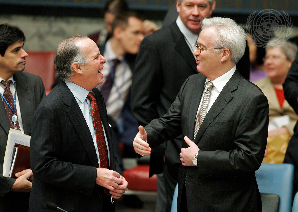 Ricardo Alberto Arias (second from left), Permanent Representative of Panama to the United Nations, speaks with Vitaly I. Churkin (right), Permanent Representative of the Russian Federation to the United Nations, prior to the ministerial Security Council meeting on the situation in the Middle East, including the Palestinian question.