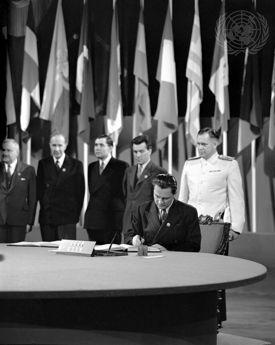 K.V. Novikov, member of the Delegation from the Union of Soviet Socialist Republics, signing the United Nations Charter at a ceremony held at the Veterans' War Memorial Building on 26 June 1945.