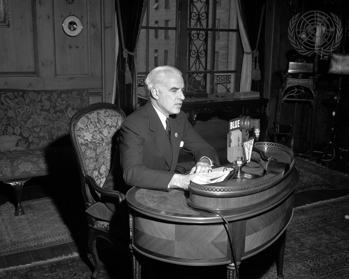 Edward R. Stettinius, Jr., Secretary of State and Chairman of the United States Delegation, at his broadcast outlining the American foreign policy gives statement of the Conference progress on a nation-wide hookup. [Exact date unknown]