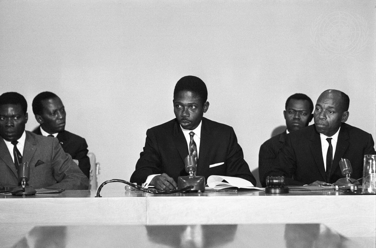 Participating in this morning’s debate (left to right): Mr. Joseph Ngoua, Minister of National Defense and head of the delegation of Gabon to the eighteenth General Assembly, Mr. Charles D. Ganao, Minister of Foreign Affairs of Congo (Brazzaville), and Mr. Emmanuel Dadet, Permanent Representative of Congo (Brazzaville) to the United Nations.
