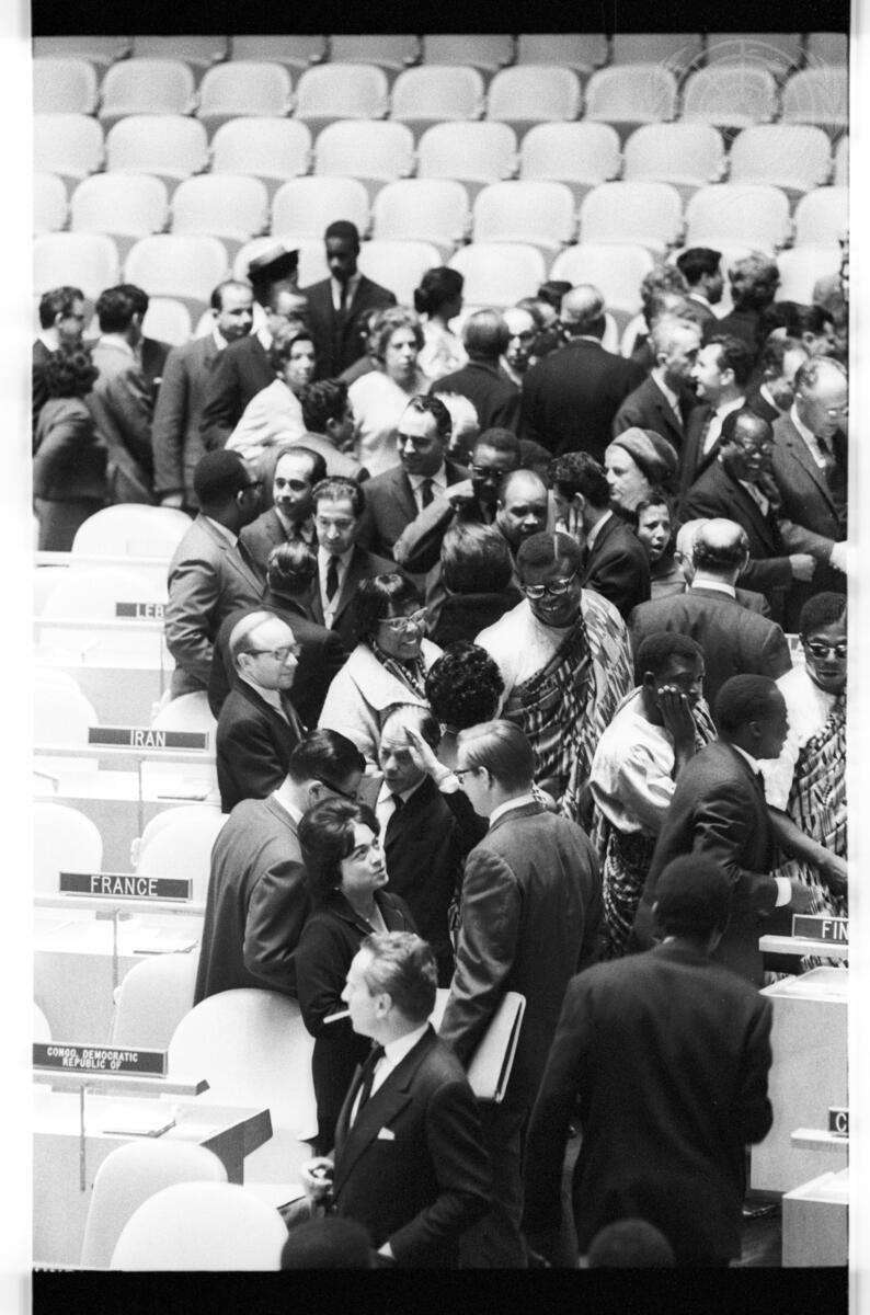 Delegations are seen leaving the Assembly Hall at the conclusion of the opening meeting. Members of the delegation of Ghana can be seen in the centre of the photograph.