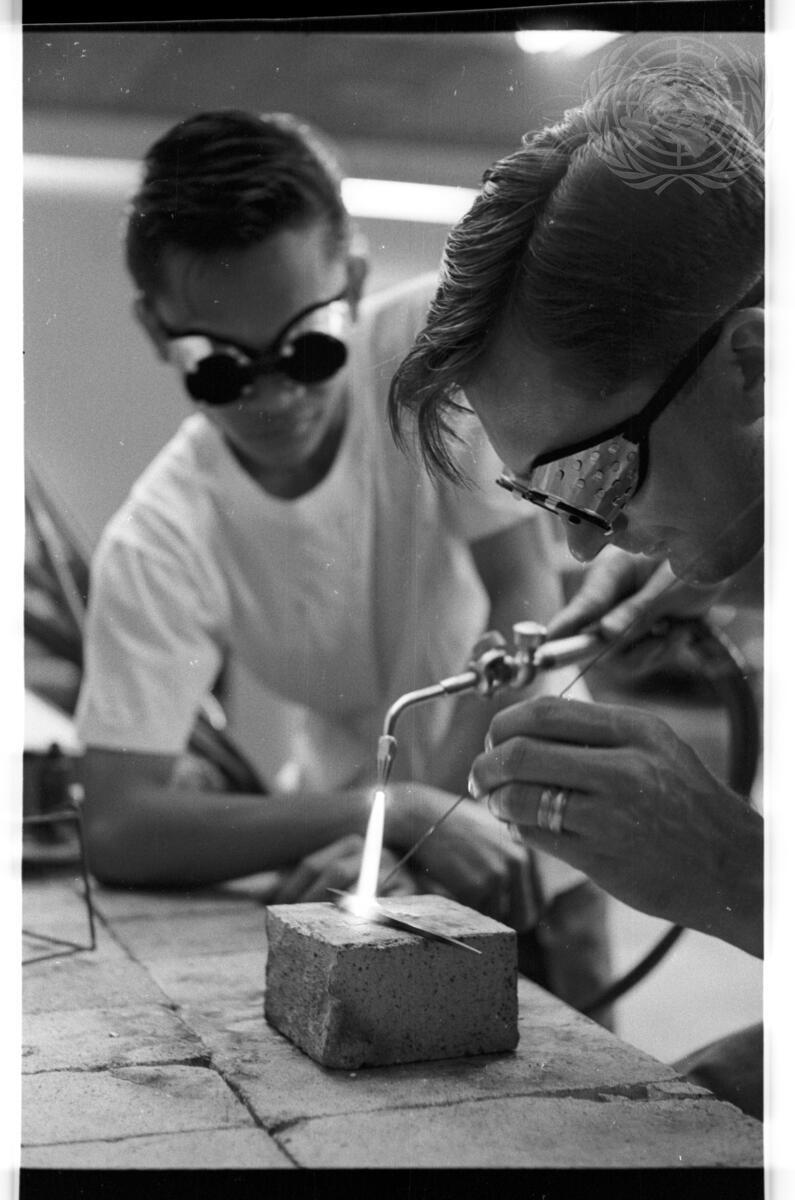 UNESCO expert, S. Hakansson (Sweden), with a trainee working with a welding machine in the Precision Instruments Section. Previous technical training is not required but the trainees must have a high school background. The course lasts for three years.