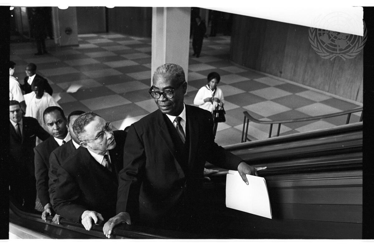 Delegates are seen arriving at UN Headquarters to attend a meeting of the General Assembly. In the foreground is Mr. Rene Chalmers, Foreign Minister of Haiti. Directly behind him is Mr. Carlet R. Auguste, Permanent Representative of Haiti to the UN.
