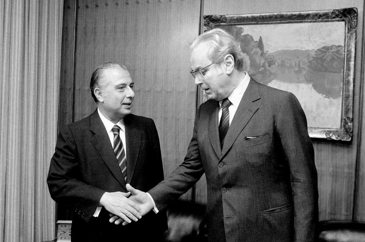 Secretary-General Javier Perez de Cuellar greeting Spyros Kyprianou.