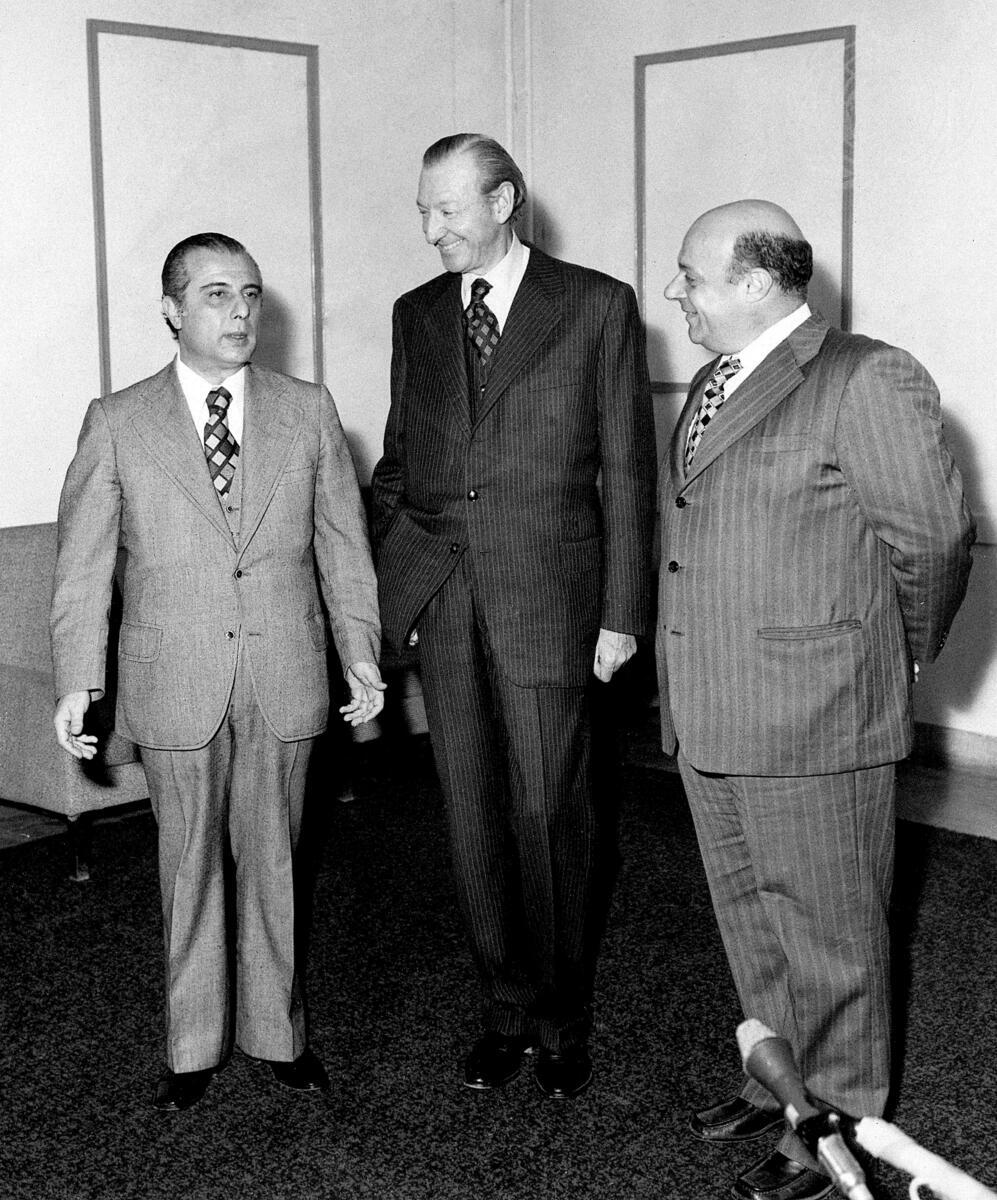 Secretary-General Kurt Waldheim meeting with President Spyros Kyprianou (left) and Mr. Rauf Denktash (right) on the afternoon of 14 January.
