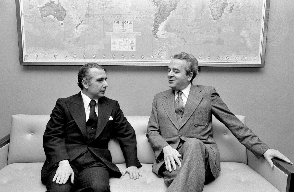 The President of the Republic of Cyprus, Spyros Kyprianou, visited United Nations Headquarters today to confer with Secretary-General Kurt Waldheim and to address the General Assembly. Mr. Kyprianou (left) is seen as he met with Lazar Mojsov (Yugoslavia), President of the General Assembly.