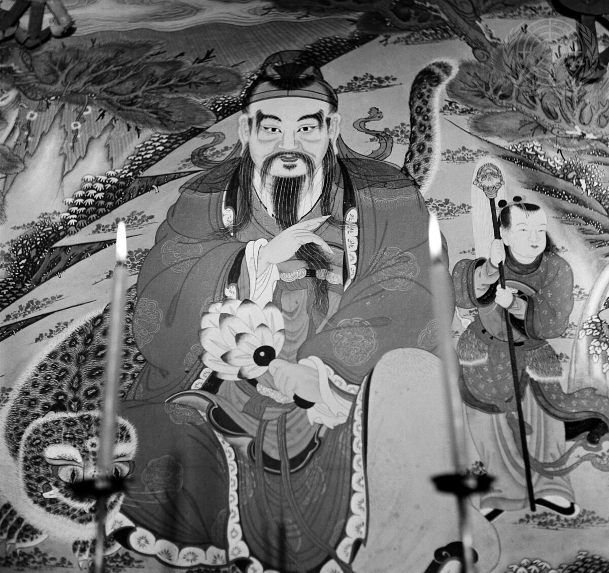 Paintings on the wall of a Buddhist temple in South Korea. The temple dates from 982 A.D. and was only slightly damaged when 500 Communist troops were bulleted in it during the war.