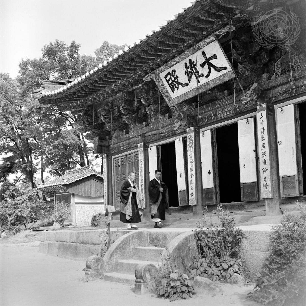 A Buddhist temple in South Korea which survived the war with only slight damage. Five hundred communist troops were billeted in it at one time. The temple dates from 982 A.D. and is maintained by revenue from the land it owns, receiving one-third of the crop planted on them. It also receives contributions from its parts of 100 families. In the parish of this temple only 10% of the people are Buddhist. About the same number are Christian and the rest are atheists.
