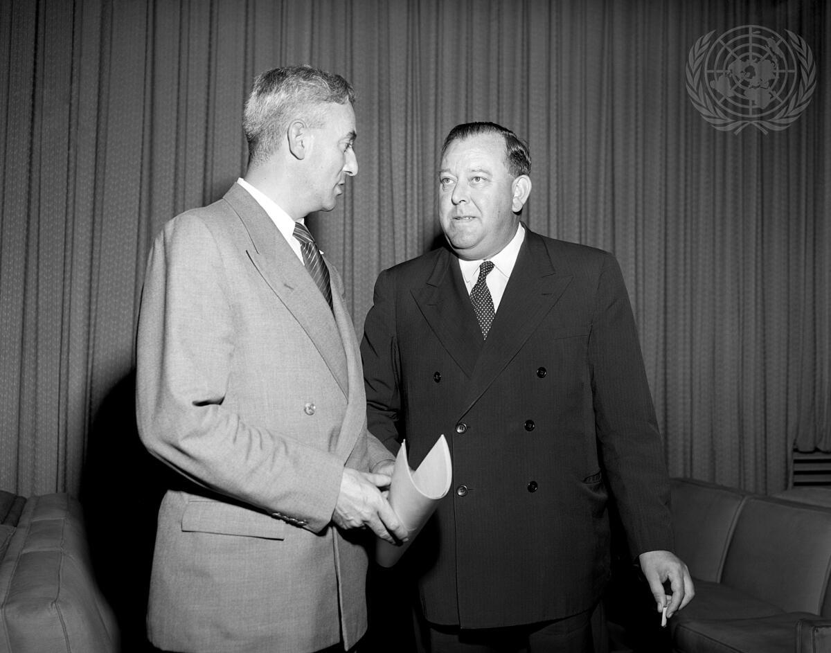 Colonel Alfred G. Katzin (left), recently appointed as Personal Representative in Korea of the Secretary-General, photographed in the United Nations delegates lounge with Secretary-General Trygve Lie.
