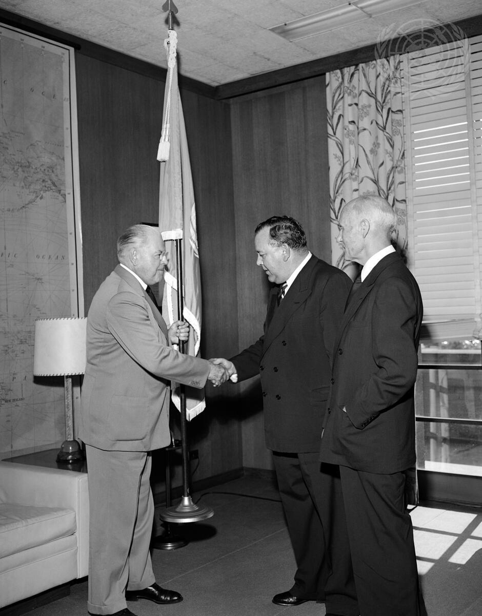 On July 7, 1950, after the vote of the Security Council deciding to autorise the Commander-in-Chief of the unified forces fighting in Korea to use the UN flag at their headquarters until the re-establishment of peace in this area of the world, Secretary-General Trygve Lie (centre) gives to Ambassador Warren Austin (left), US Representative to the Security Council, the UN flag, which which was used by the UN military observers and the UN Mediator in Palestine. The flag will be sent to Korea. At right, Ambassador Arne Sunde, of Norway, current President of the Security Council looks on.