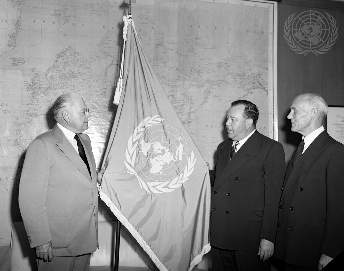 On July 7, 1950, in the presence of Ambassador Arne Sunde (right) of Norway, and President of the Security Council for the month of July, Mr. Trygve Lie (center), UN Secretary-General, presents to Ambassador Warren Austin (left), Permanent Representative of the United States to the United Nations a flag which was used by the UN military observers and the UN Mediator in Palestine. Now, it will be sent to the Commander-in-chief of the unified forces acting on behalf of the United Nations, to be flown at their headquarters until peace is re-established in Korea.