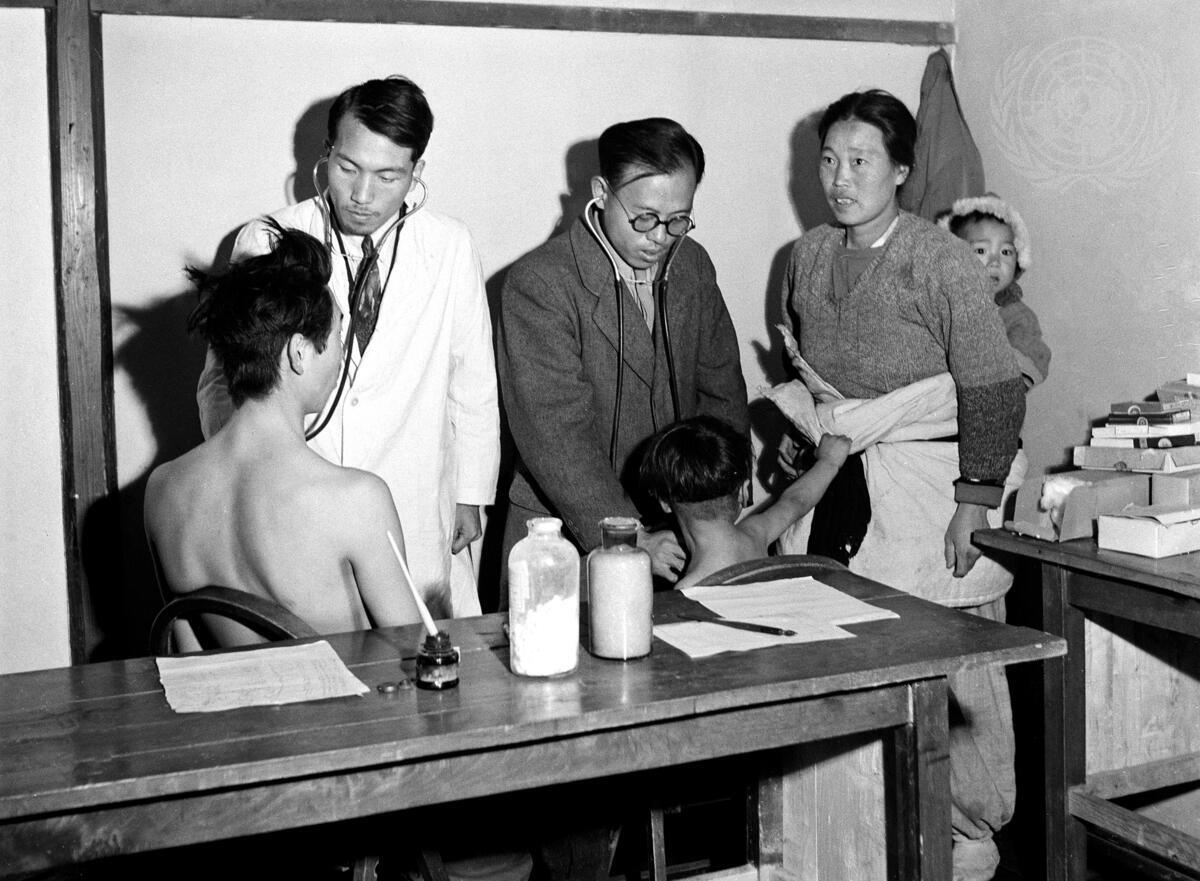 Korean doctors examine newly-arrived refugees in a dispensary in Changsunp'o-ri on Koje Island. Some of the doctors and nurses on the island are themselves refugees. [January 1951]