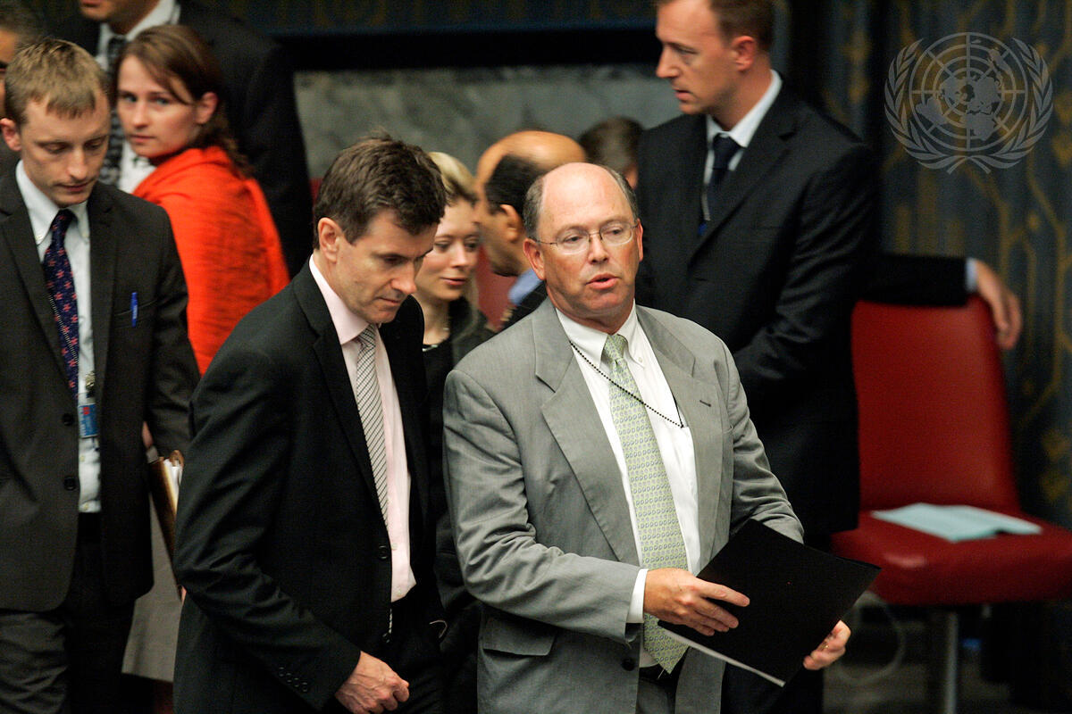 John Sawers (third from left), Permanent Representative of the United Kingdom of Great Britain and Northern Ireland to the United Nations, and Alejandro Daniel Wolff (second from right), Deputy Permanent Representative of the United States of America to the United Nations, prior to a Security Council meeting on the extension of the African Union-United Nations Hybrid Operation in Darfur (UNAMID).