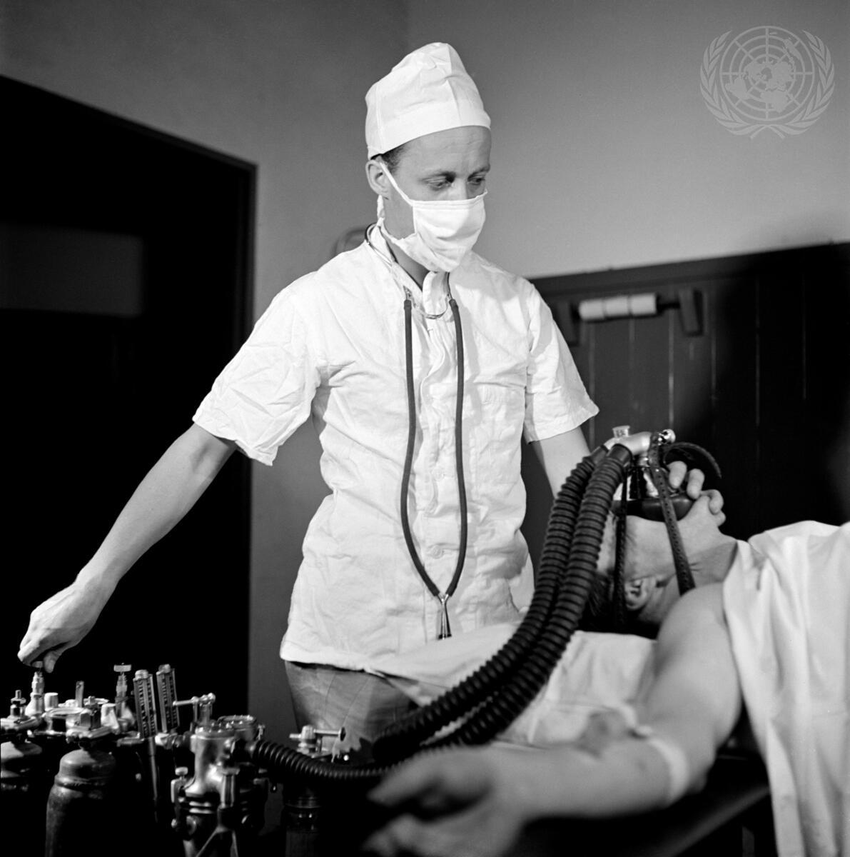 A physician of the Hospital Field Unit contributed by Sweden to the Unified Forces in Korea administrates anesthesia to a wounded American soldier during an operation.