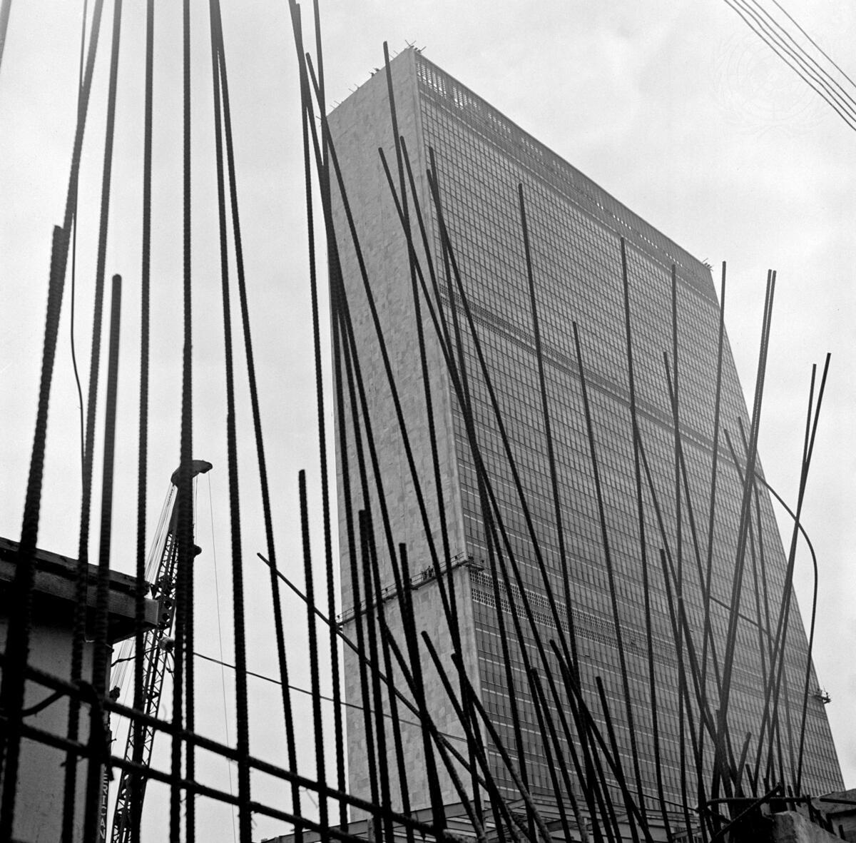 The Secretariat building, at United Nations Headquarters in New York. In the foreground are the steel reinforcing bars used for other construction on the U.N. site. 1951.