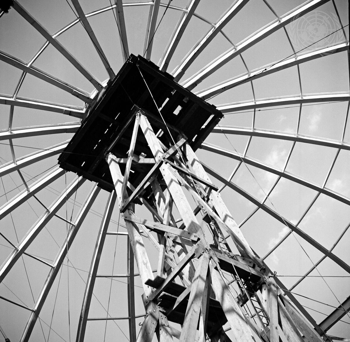 The steel structure of the dome on top of the General Assembly Hall at United Nations Headquarters, in New York, has just been completed.