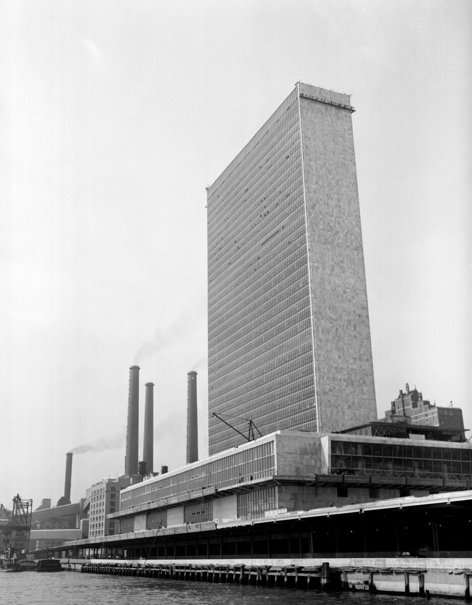 The building of the Secretariat and (foreground) the nearly completed ""Conference Area"". View taken from the East River, looking south. The East River Drive runs under the Conference Area.