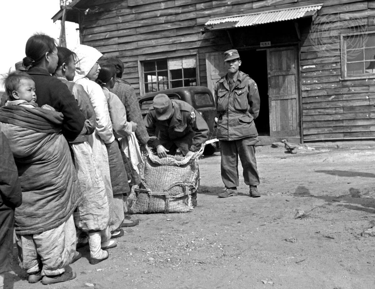 Organized by the United Nations Civil Assistance Command, the distribution of a daily ration of rice to the population of Seoul started three days after the liberation of the city. Long lines of old men, women and children formed outside the police stations to take their ration of less than a pound per person.