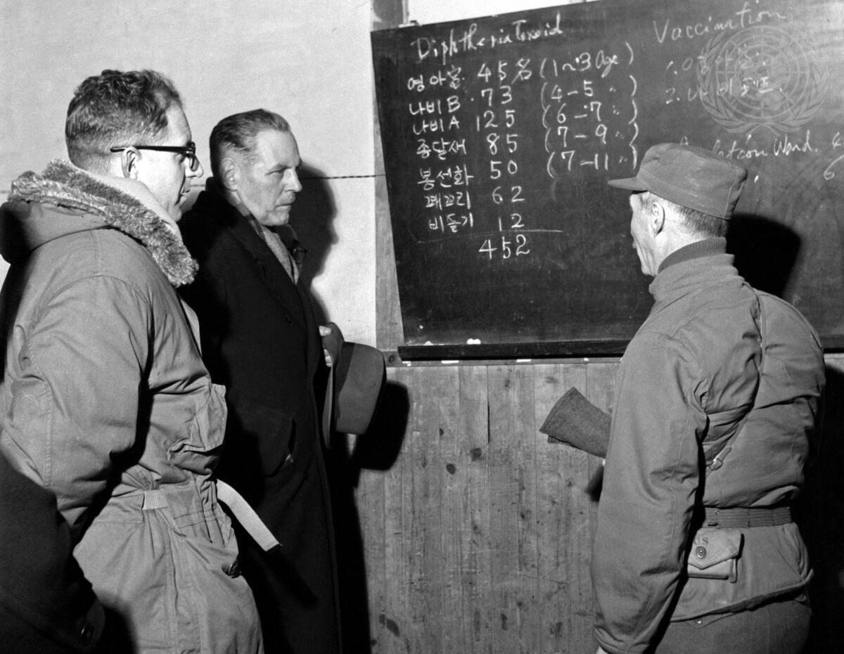 From left to right, Mr. David Ketel and Mr. Willem de Roos, Delegates of the Netherlands on the United Nations Commission for the Unification and Rehabilitation of Korea, and an American officer look over a chart of inoculation in the orphanage dispensary.