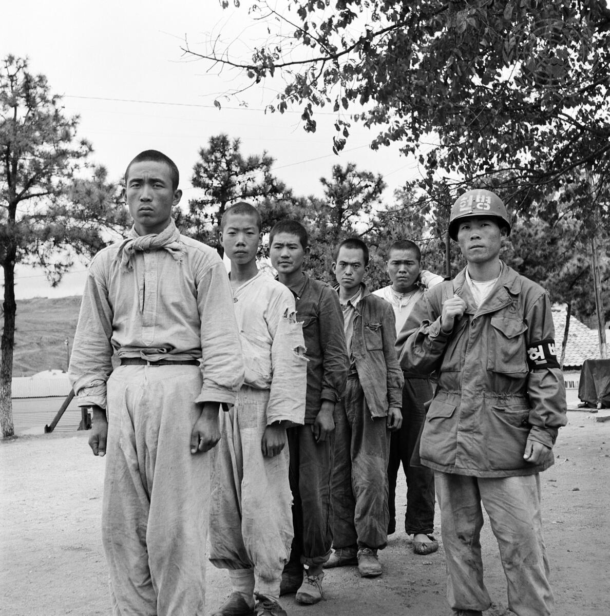 These prisoners, guarded by a South Korean soldier, are waiting to be taken to a POW camp near Inchon. [October 1950]
