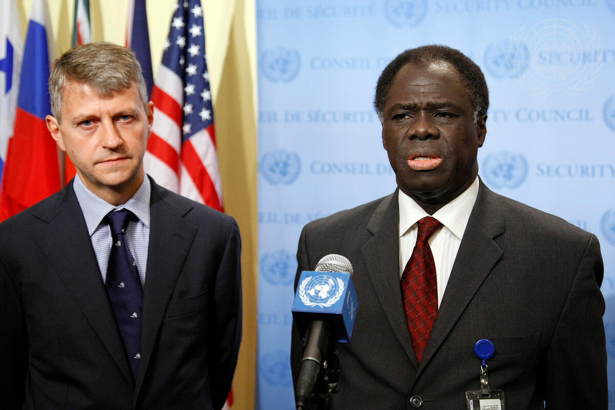 Michel Kafando (right), Permanent Representative of Burkina Faso to the United Nations, flanked by Jean-Pierre Lacroix, Deputy Permanent Representative of France to the United Nations, briefs the press following a Security Council meeting on the seventeenth progress report of the Secretary-General on the United Nations Operation in Côte d'Ivoire (ONUCI).