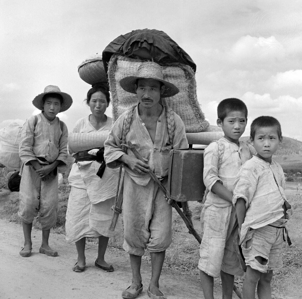 A refugee family heading for a reception in South Korea. They are fleeing from the battle area along the road between Kimhae and Masan. [September 1950]