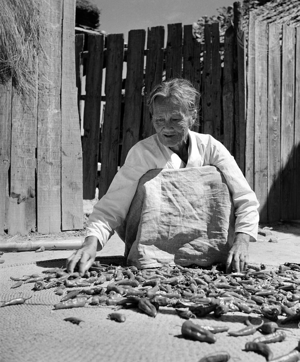 In the village of Kamjyun-ri near Pusan an old woman lays red peppers in the sun to dry.