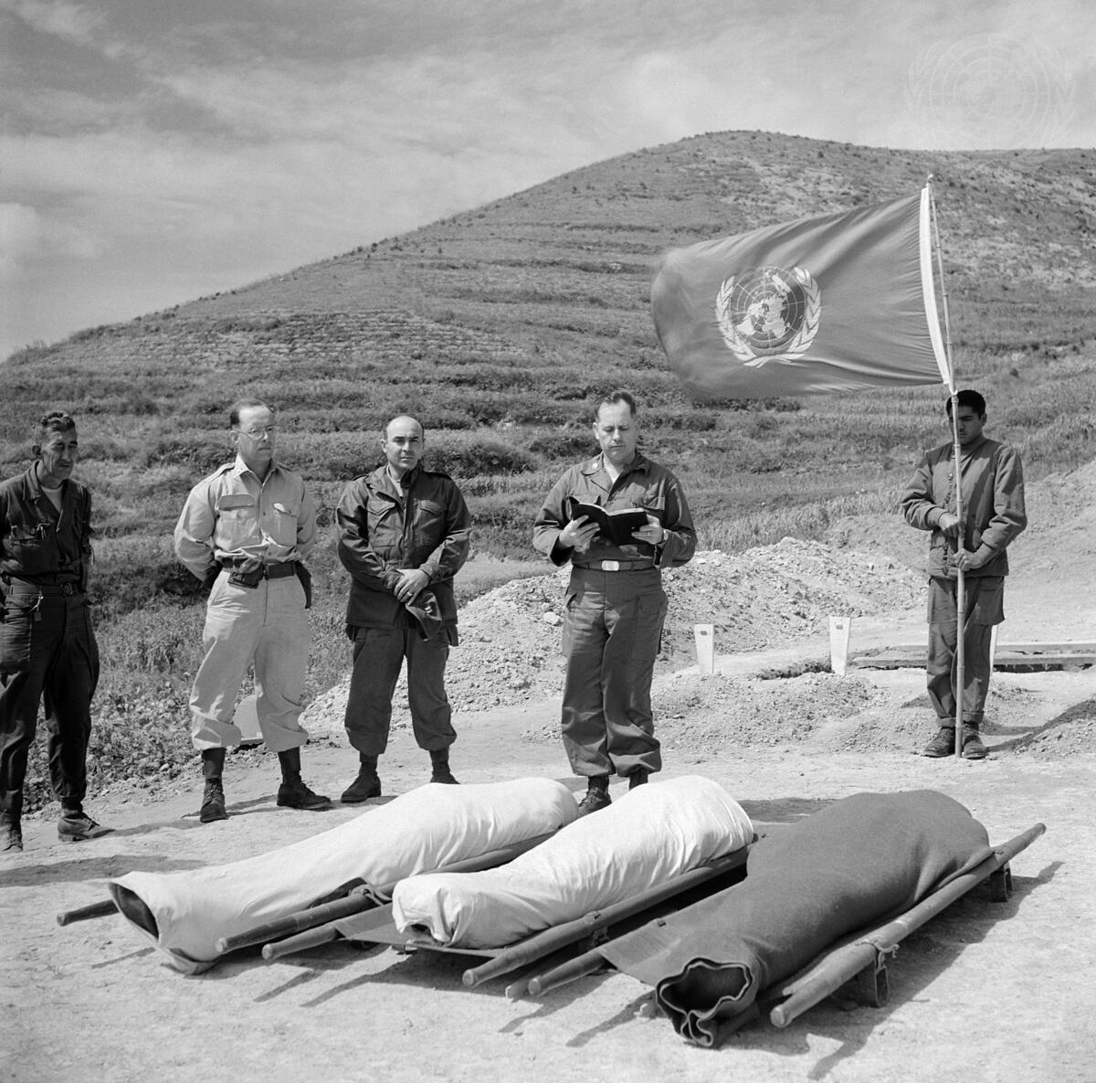 A burial service for three American soldiers is held in a United Nations military cemetery near Pusan. [September 1950]