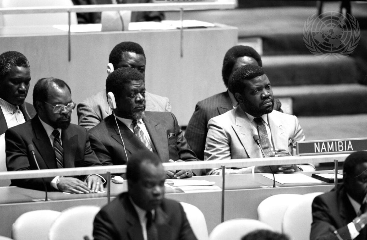 Prime Minister Hage G. Geingob of Namibia (behind name-plate) heads his country’s delegation on the historic occasion of being admitted to the United Nations. To his right is Foreign Minister Theo Ben-Gurirab.