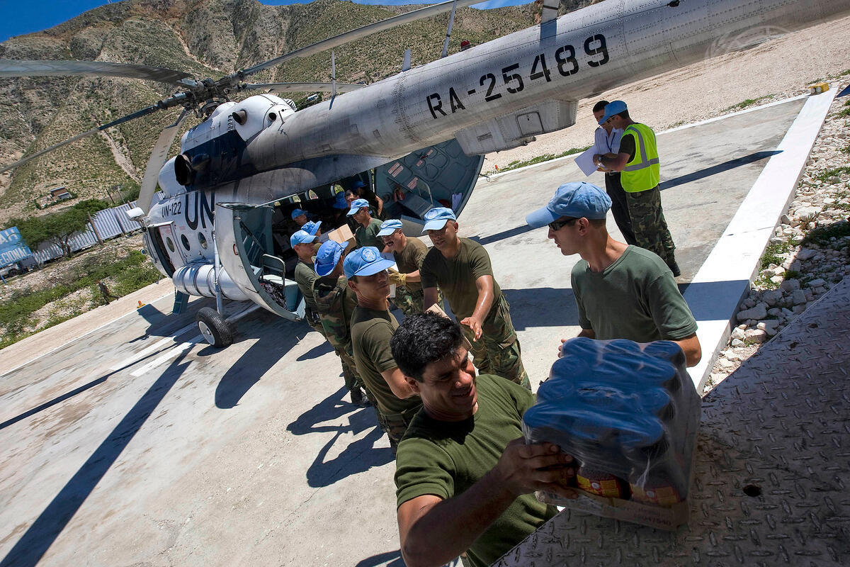 Members of the Argentinean battalion of the United Nations Stabilization Mission in Haiti (MINUSTAH) unload food and water supplies from a UN helicopter for distribution to the victims of the tropical storm "Hanna".