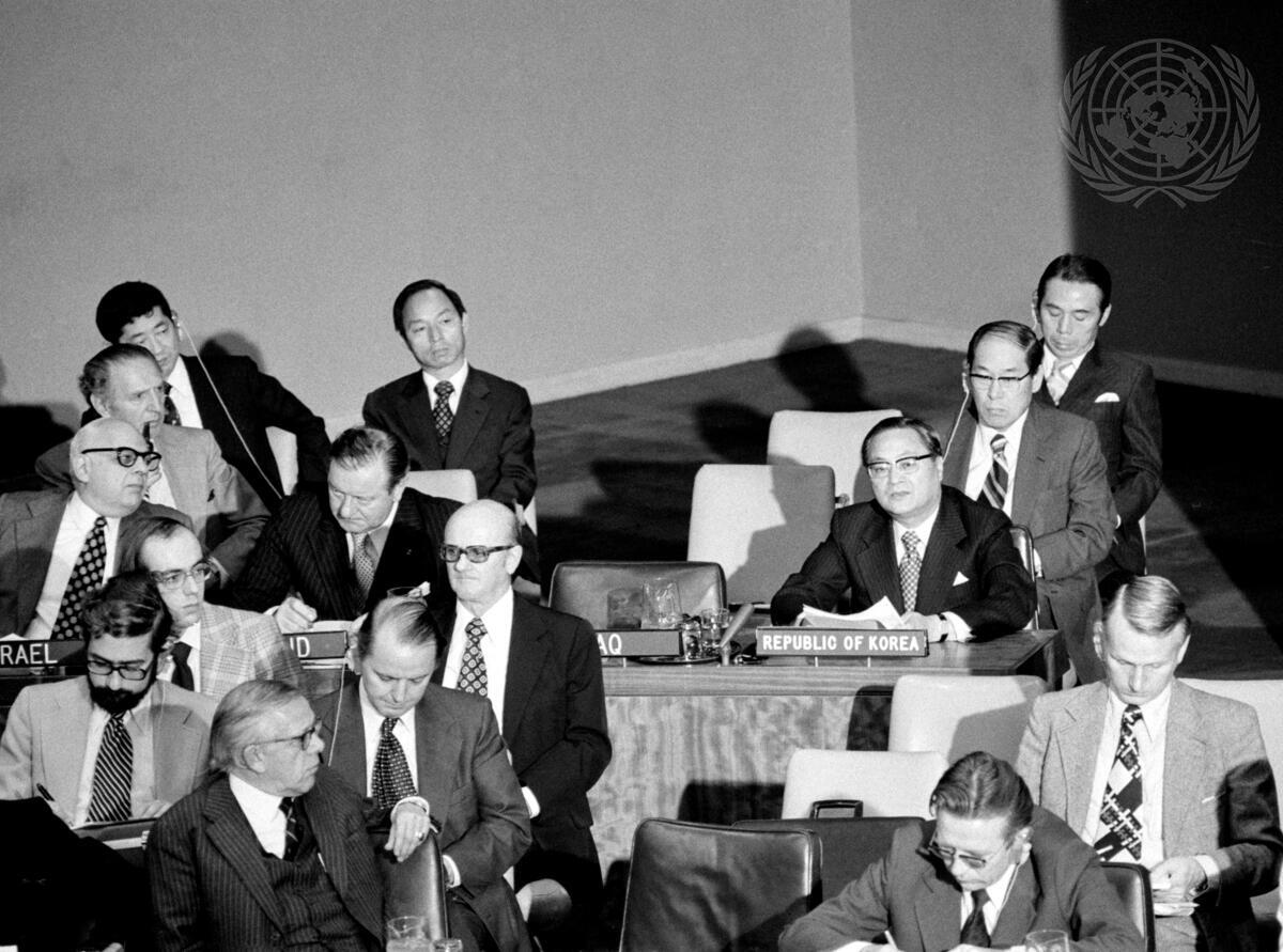 The First Committee (Political and Security), began this morning its consideration of the question of Korea, hearing statements by the representatives of Algeria, the Republic of Korea, Japan, France, Central African Republic and Paraguay. Seated at right in the background is the delegation of the Republic of Korea headed by Dong-Jo Kim (seated at the table), Minister for Foreign Affairs.