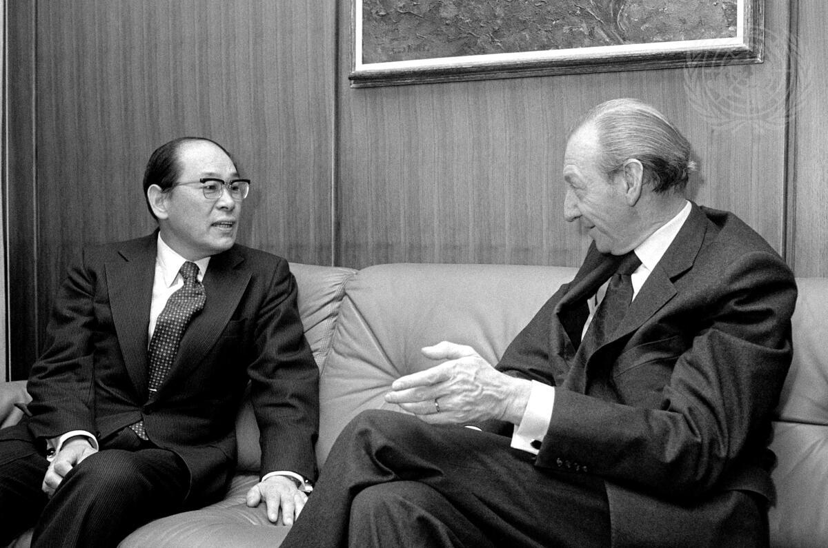 Tong Jin Park (left), Foreign Minister of the Republic of Korea is seen as he met with Secretary-General Kurt Waldheim at United Nations Headquarters today.