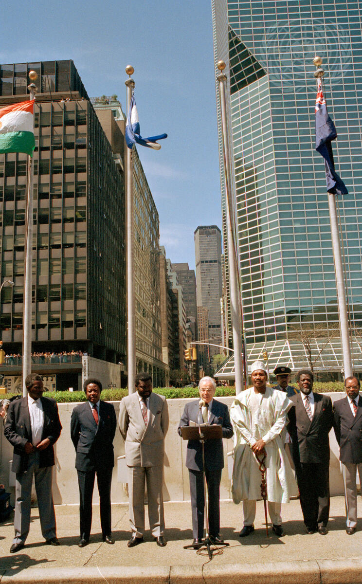 Secretary-General Javier Perez de Cuellar (fourth from left) speaking at the flag-raising ceremony after Namibia was admitted to the United Nations earlier today. Attending the ceremony are Prime Minister Hage G. Geingob of Namibia (third from left); Joseph N. Garba (Nigeria), President of the General Assembly (third from right); Foreign Minister Theo Ben-Gurirab of Namibia (second from right).