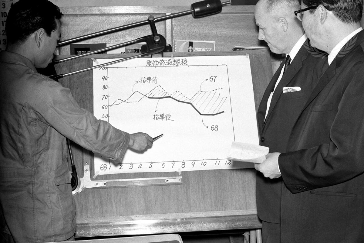 At Sambu Industrial Company, manufacturers of valves and pipe fittings, from left to right, Mr. Choi, Managing Director of the Company, discusses a cost reduction graph with Mr. Rex. C.H. Jenkins, ILO Chief of Project, and Mr. Lee C.I., Extension Services Department Manager. [1969]