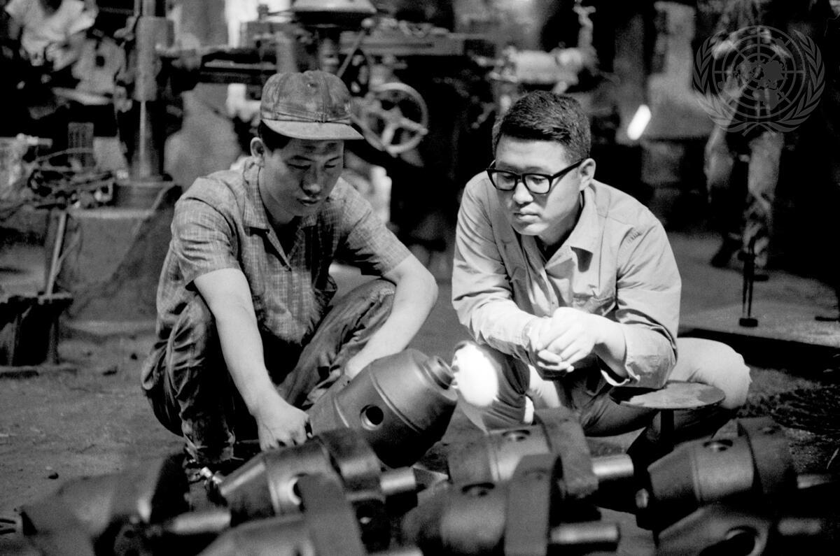 At the Hasnam Machinery Company, manufacturer of nozzles and valves, Mr. Kim H.C., Engineering Consultant from the Extension Services Department of the Medium Industry Bank, discuss the company’s products with the chief engineer. [1969]