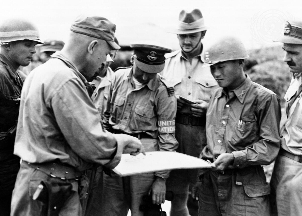 Military observers of the United Nations look over a map of Republic of Korea artillery positions at the 16th ROK Field Artillery Regiment Headquarters.