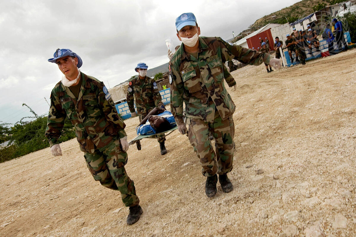 Members of the Argentinean battalion of the United Nations Stabilization Mission in Haiti (MINUSTAH) carry a wounded boy for medical treatment following the devastation caused by floods of the tropical storm "Hanna".