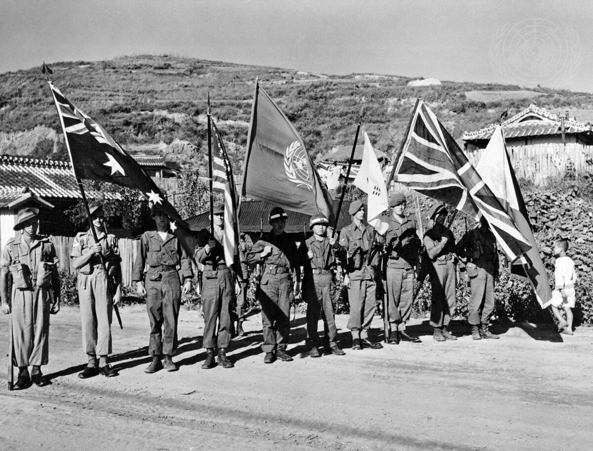 Soldiers and flags of the various armed forces fighting in Korea with the Unified Forces (September 1950). From left to right, soldiers and flag of: Australia, the United States, South Korea, the United Kingdom, and the Philippines. The UN flag is in the middle.