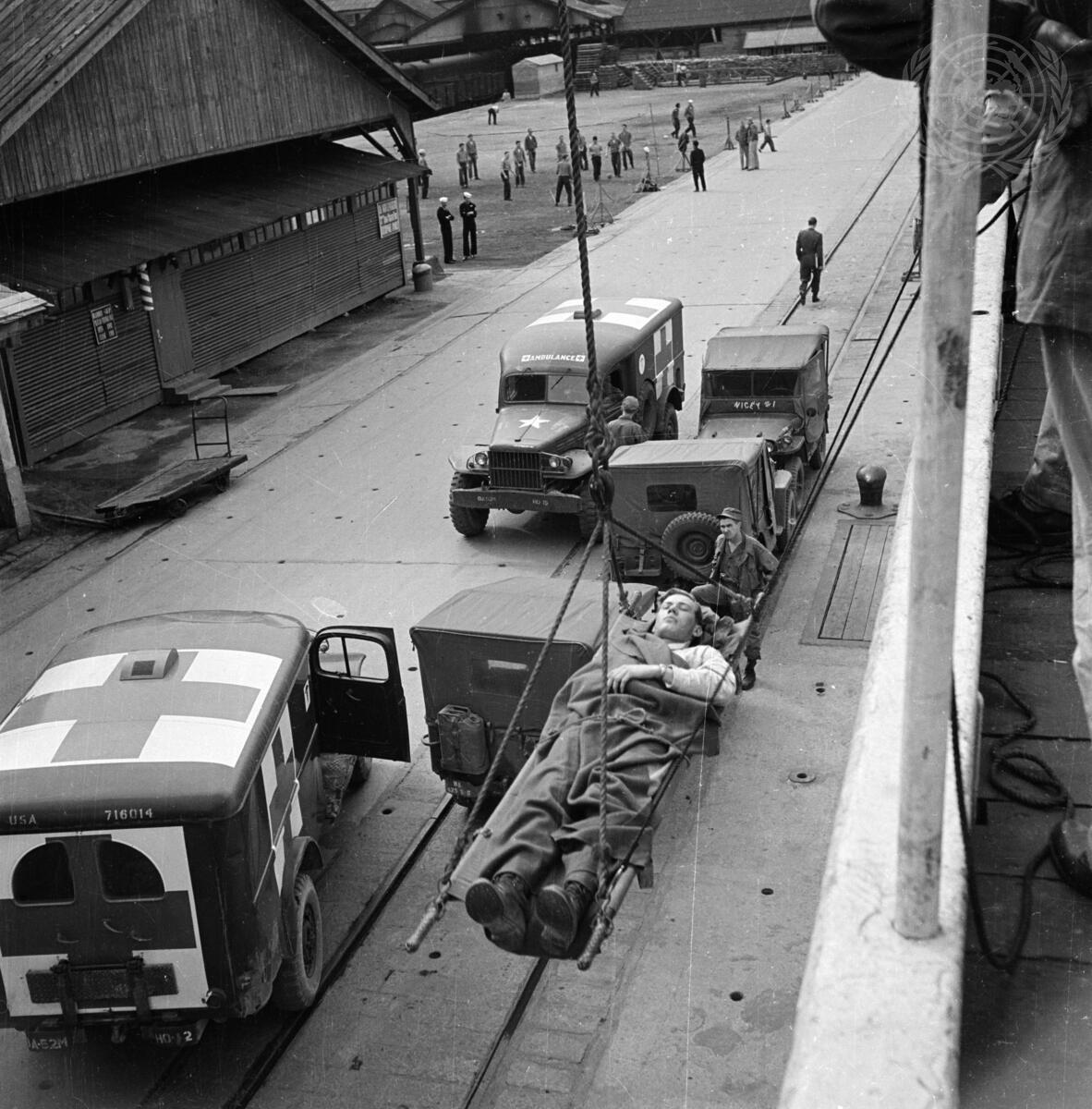Denmark's contribution to the United Nations effort in Korea is the fully manned hospital "Jutlandia" formerly a passenger liner on the North Atlantic run. The ship now in Korean waters caring for UN wounded personnel has space for 300 patients and its staff of medical and administrative volunteers number one hundred. Here a patient, who has arrived by ambulance, perhaps from a nearby railroad station or airbase, is lifted aboard the "Jutlandia" by lifter. [No exact date]