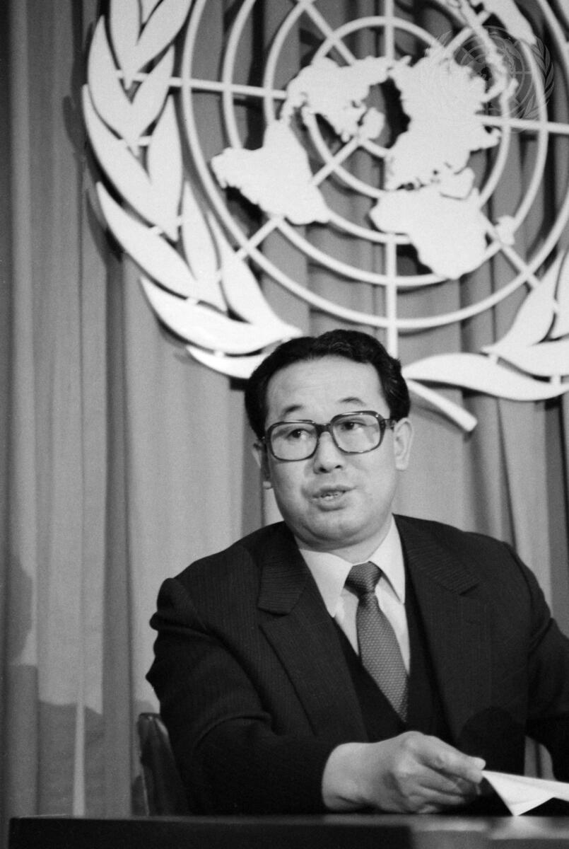 Pak Gil Yon, Permanent Observer of the Democratic People's Republic of Korea Mission to the UN, speaking at a press conference at UN Headquarters. Referring to the Korean Airline plane which exploded in Burmese air space in November 1987, he said that he wished to provide an accurate picture of the incident.