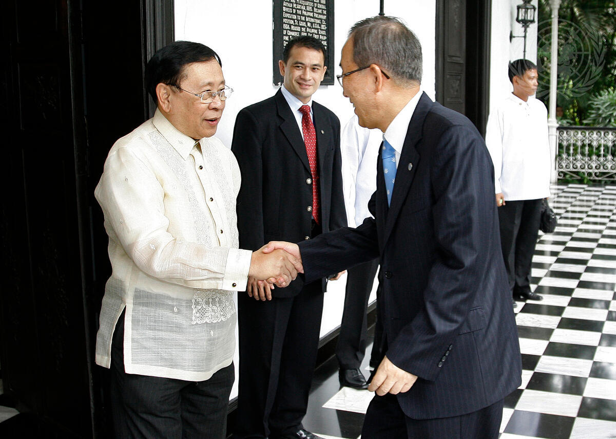 Secretary-General Ban Ki-moon (second from right) greets Alberto Romulo, Secretary of Foreign Affairs of the Philippines.