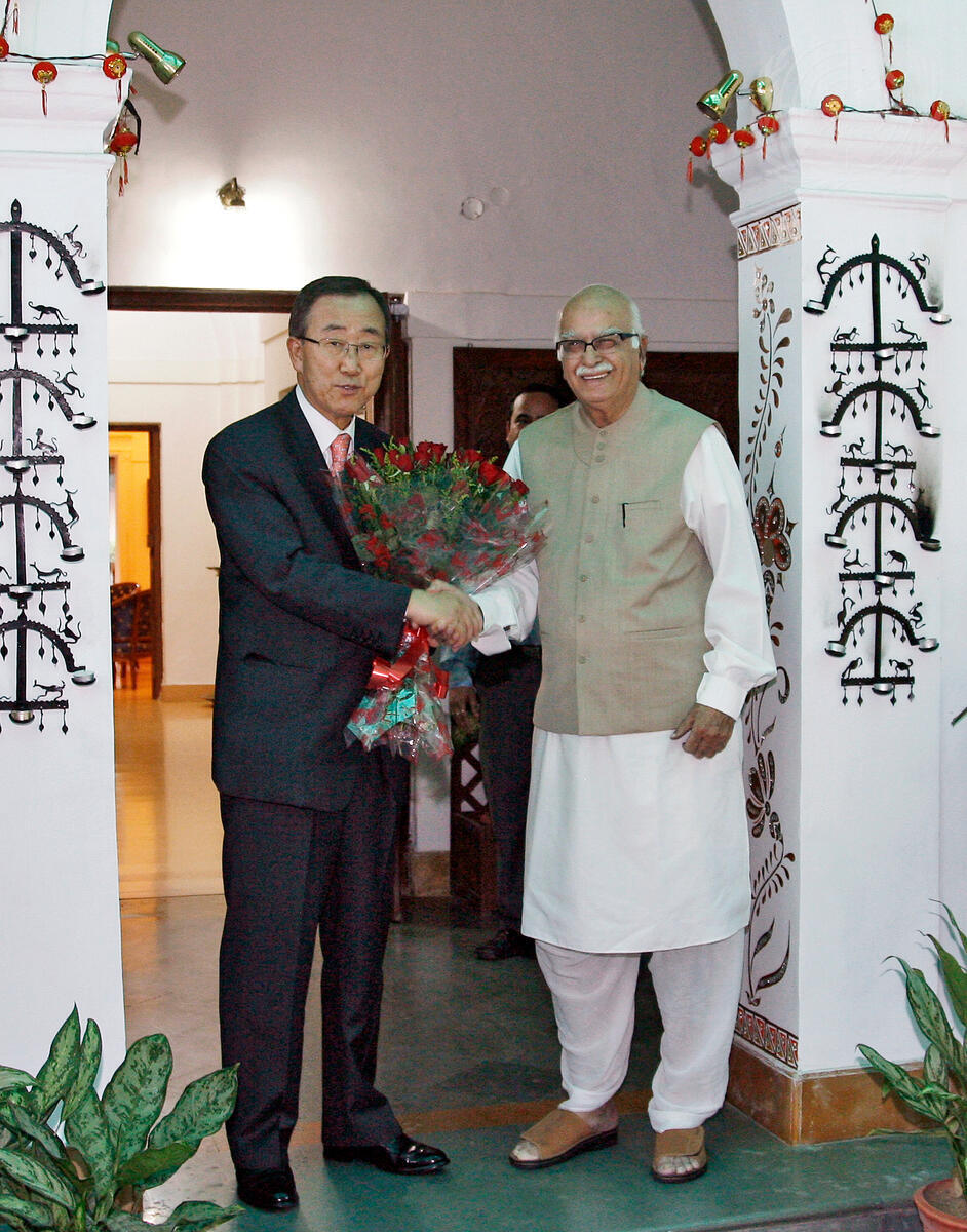 Secretary-General Ban Ki-moon (left) meets with Lal Krishna Advani, leader of the Bharatiya Janata Party of India.