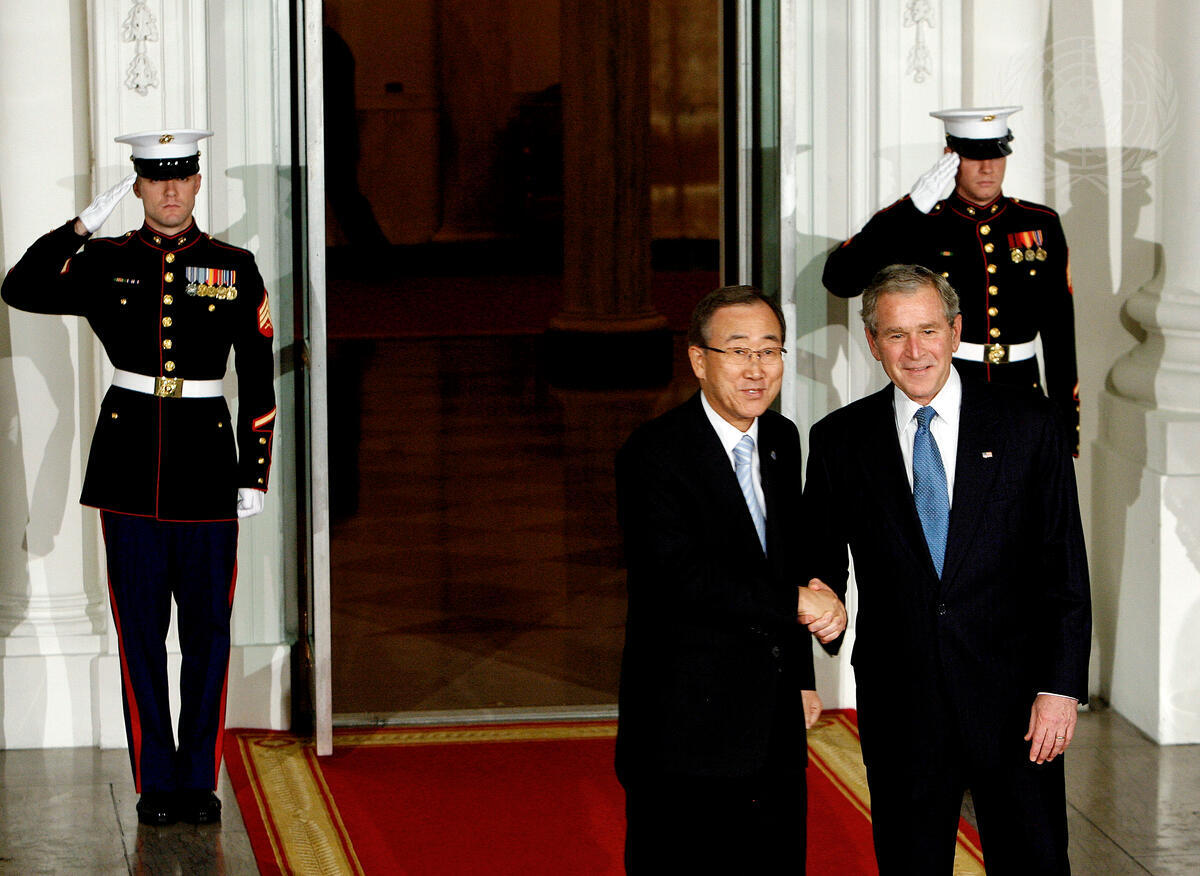 George W. Bush (right), President of the United States of America, welcomes Secretary-General Ban Ki-moon, upon arrival for a dinner on the eve of a meeting of the group of twenty industrialized and developing countries on the Financial Markets and the World Economy.