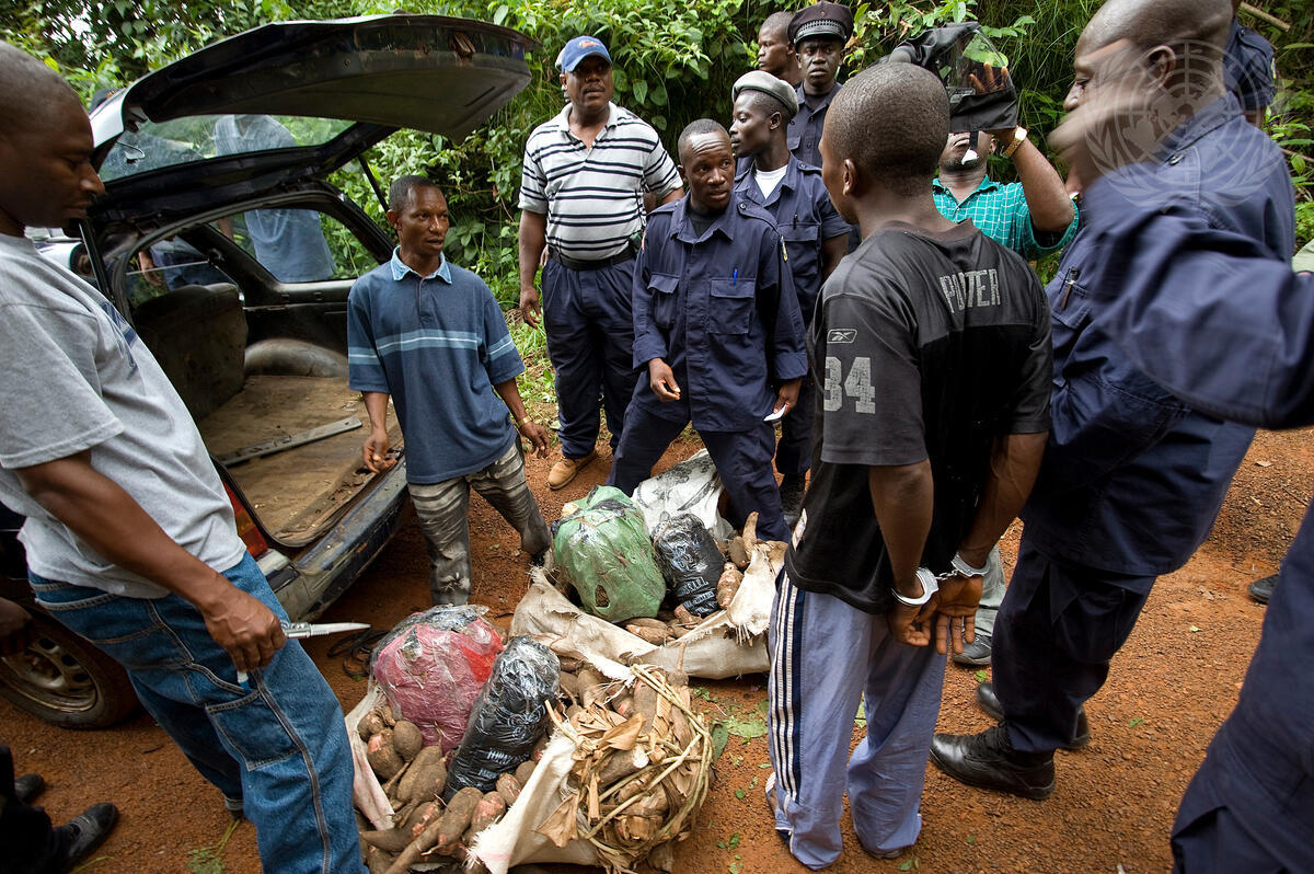 Members of the Liberian National Police find two plastic bags of marijuana, weighing more than 50 kilograms, during a road check.