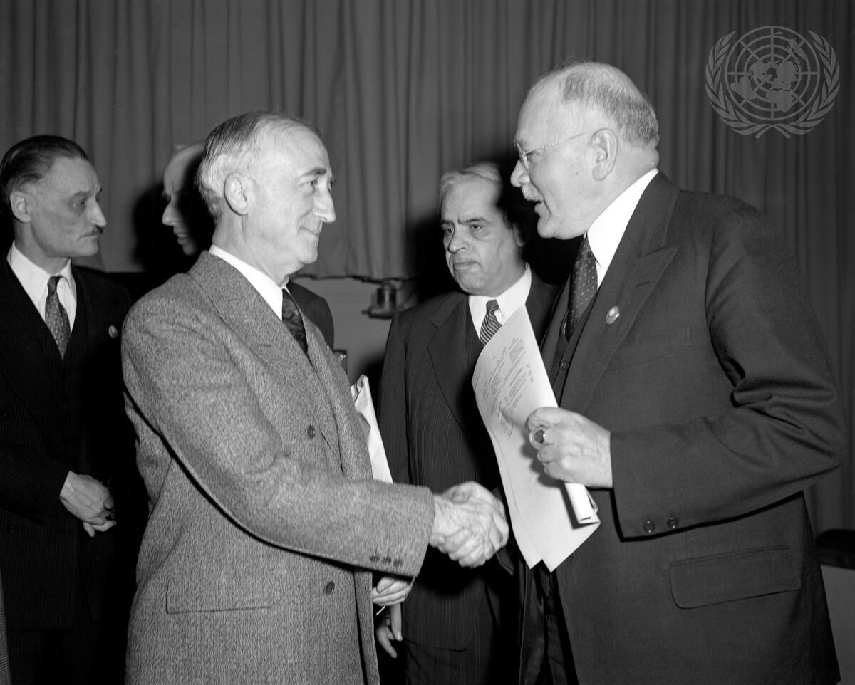 Secretary of State James F. Byrnes greets an old friend H. V. Kaltenborn before entering the United Nations Security Council chamber. In the background are France's Henri Bonnet, Dr. Eelco van Kleffens of the Netherlands and Mexico's Foreign Minister Dr. Francisco Castillo Najera. Hunter College, 27 March 1946.