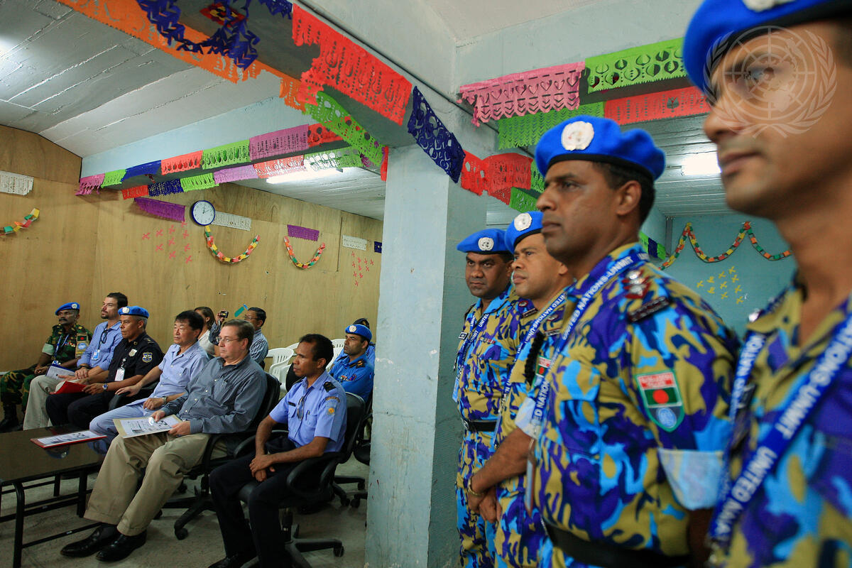Dmitry Titov (fifth from left, front row), Assistant Secretary-General for Rule of Law and Security Institutions in the Department of Peacekeeping Operations, receives a briefing concerning the activity of the Bangladesh Formed Police Unit (FPU) during his tour of the United Nations Mission in Timor-Leste (UNMIT).
