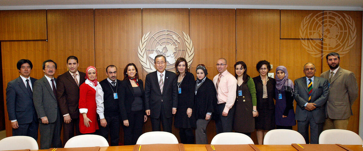 Secretary-General Ban Ki-moon (seventh from left), Kiyotaka Akasaka (second from left), Under-Secretary-General for Communications and Public Information, and other senior United Nations Officials, pose for a group photo with the Palestinian media trainees.
