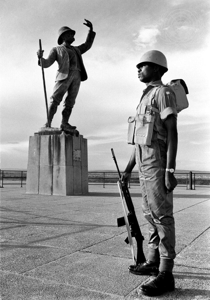 A member of the U.N. Force's 2nd Queen's Own Nigerian Regiment photographed on duty at the Stanley Monument in Leopoldville. December 1962.