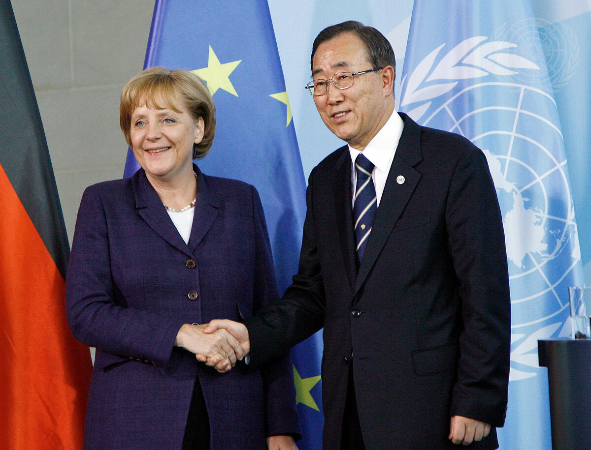 Secretary-General Ban Ki-moon (right) shakes hands with Angela Merkel, Chancellor of Germany.